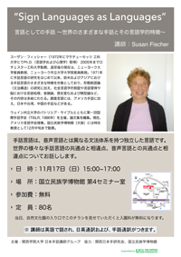 内 容:「Sign Languages as Languages (言語としての手話 ~世界のさまざまな手話とその言語学的特徴~)」
